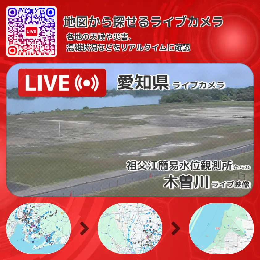 木曽川の他に、市営祖父江ワイルドネイチャー緑地や周辺の気象状況も併せてチェックすることが可能で、台風・大雨・地震などの災害による被害状況も把握することができます。