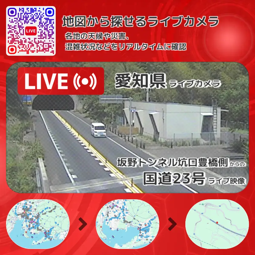 国道23号(名豊道路・蒲郡バイパス)の他に、坂野トンネルや周辺の気象状況も併せてチェックすることが可能で、台風・大雨・地震などの災害による被害状況も把握することができます。