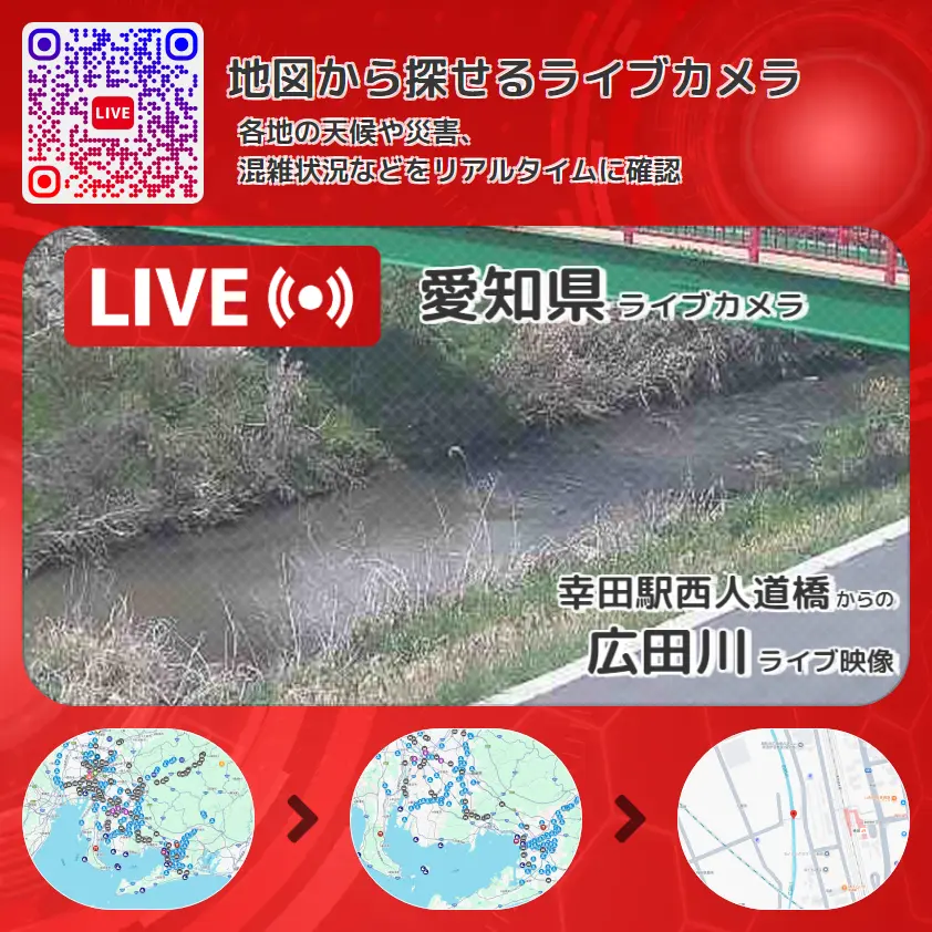 広田川の他に、幸田駅西人道橋(なかよし橋)や周辺の気象状況も併せてチェックすることが可能で、台風・大雨・地震などの災害による被害状況も把握することができます。