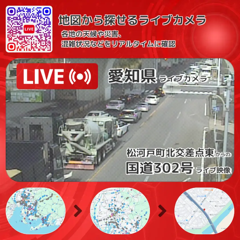 国道302号(環状2号線)の他に、愛知県道30号関田名古屋線や周辺の気象状況も併せてチェックすることが可能で、台風・大雨・地震などの災害による被害状況も把握することができます。