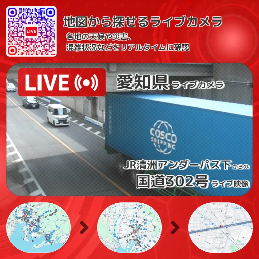 国道302号(環状2号線)の他に、JR清洲アンダーパスや周辺の気象状況も併せてチェックすることが可能で、台風・大雨・地震などの災害による被害状況も把握することができます。