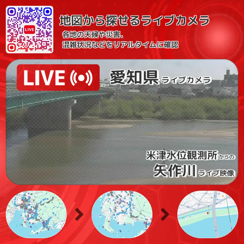 矢作川の他に、愛知県道12号豊田一色線や周辺の気象状況も併せてチェックすることが可能で、台風・大雨・地震などの災害による被害状況も把握することができます。