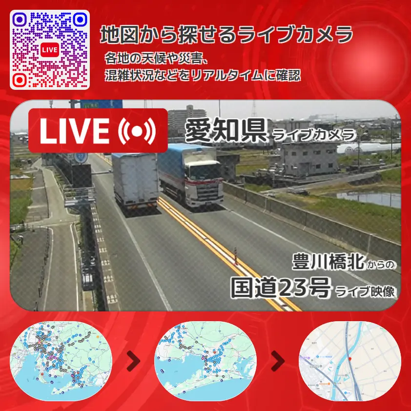 国道23号(名豊道路・豊橋バイパス・蒲郡街道)の他に、国道247号や周辺の気象状況も併せてチェックすることが可能で、台風・大雨・地震などの災害による被害状況も把握することができます。