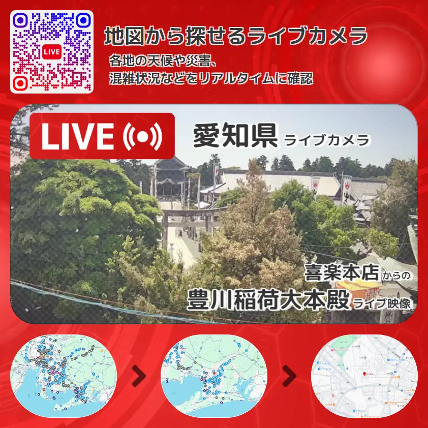 豊川稲荷大本殿の他に、豊川稲荷境内や周辺の気象状況も併せてチェックすることが可能で、台風・大雨・地震などの災害による被害状況も把握することができます。
