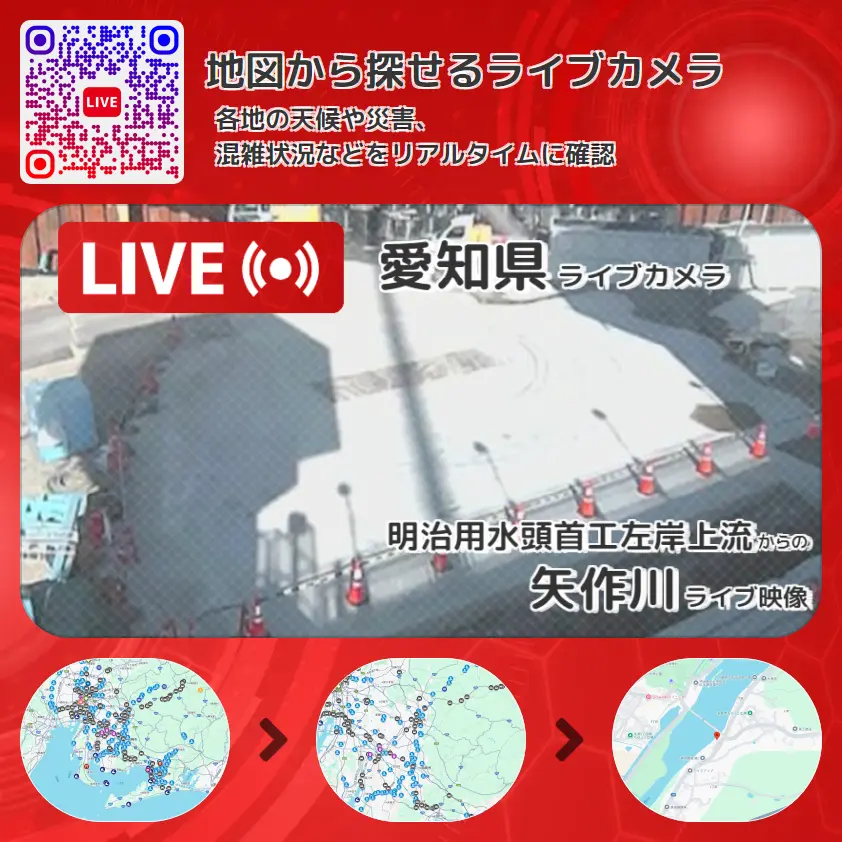 矢作川の他に、明治用水頭首工(水源橋)や周辺の気象状況も併せてチェックすることが可能で、台風・大雨・地震などの災害による被害状況も把握することができます。