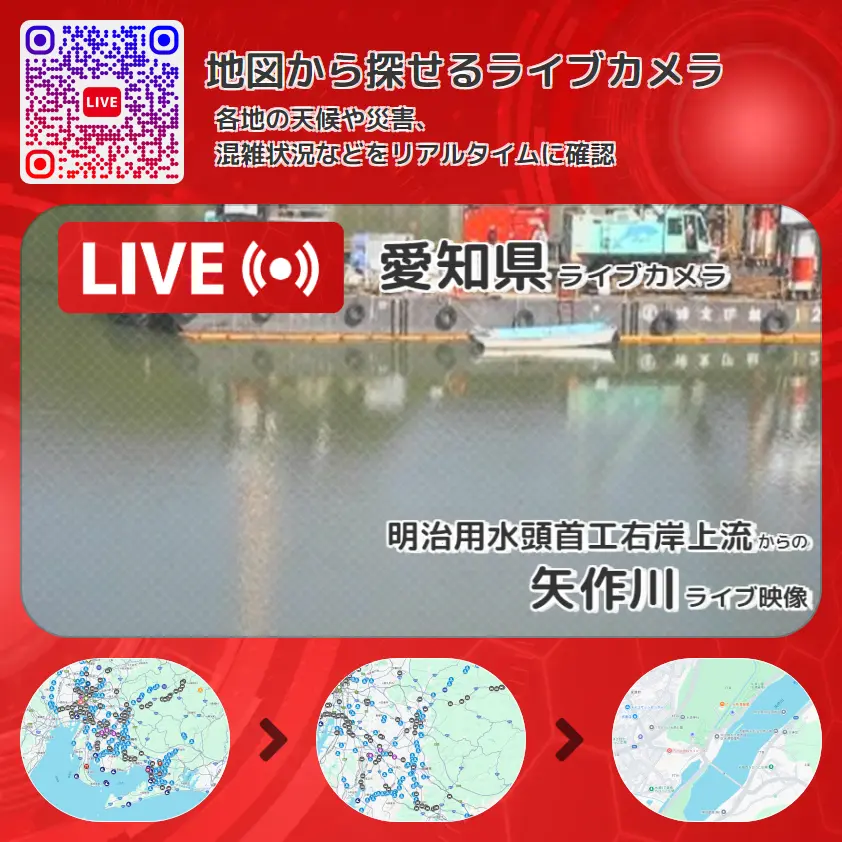 矢作川の他に、明治用水頭首工(水源橋)や周辺の気象状況も併せてチェックすることが可能で、台風・大雨・地震などの災害による被害状況も把握することができます。