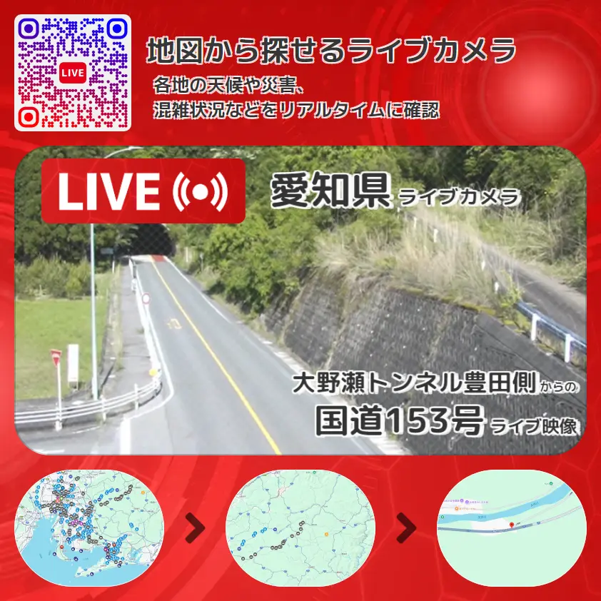 国道153号の他に、大野瀬トンネルや周辺の気象状況も併せてチェックすることが可能で、台風・大雨・地震などの災害による被害状況も把握することができます。