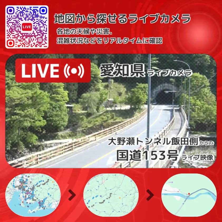 国道153号の他に、上郷大橋や周辺の気象状況も併せてチェックすることが可能で、台風・大雨・地震などの災害による被害状況も把握することができます。