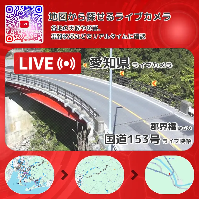 国道153号の他に、郡界橋や周辺の気象状況も併せてチェックすることが可能で、台風・大雨・地震などの災害による被害状況も把握することができます。