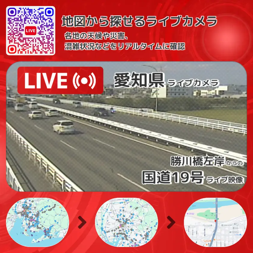 国道19号の他に、愛知県道59号名古屋中環状線や周辺の気象状況も併せてチェックすることが可能で、台風・大雨・地震などの災害による被害状況も把握することができます。