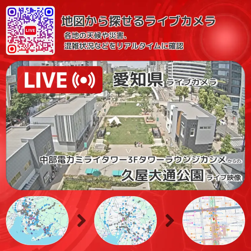 久屋大通公園の他に、国道19号(桜通)や周辺の気象状況も併せてチェックすることが可能で、台風・大雨・地震などの災害による被害状況も把握することができます。