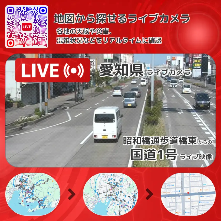 国道1号の他に、昭和橋通3交差点付近や周辺の気象状況も併せてチェックすることが可能で、台風・大雨・地震などの災害による被害状況も把握することができます。