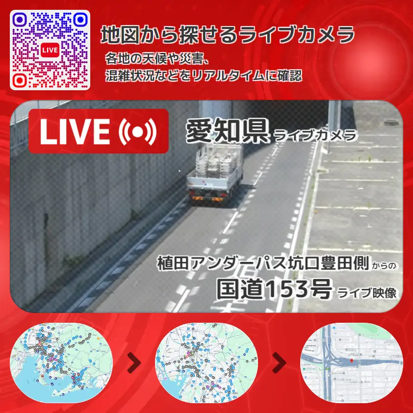 国道153号の他に、植田アンダーパスや周辺の気象状況も併せてチェックすることが可能で、台風・大雨・地震などの災害による被害状況も把握することができます。