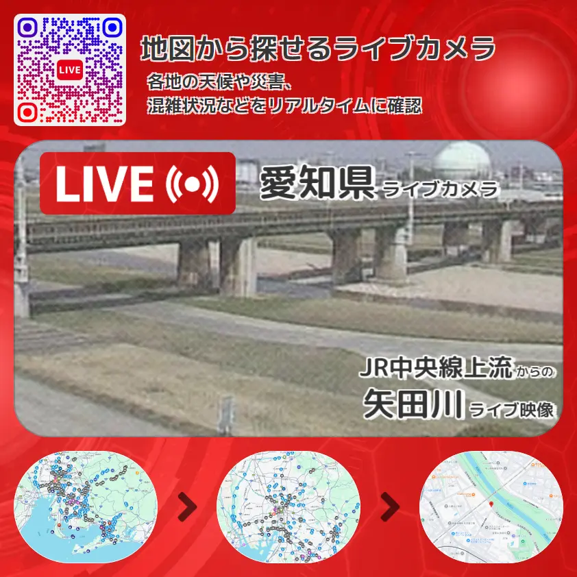 矢田川の他に、JR中央本線(大曽根駅~新守山駅間)や周辺の気象状況も併せてチェックすることが可能で、台風・大雨・地震などの災害による被害状況も把握することができます。