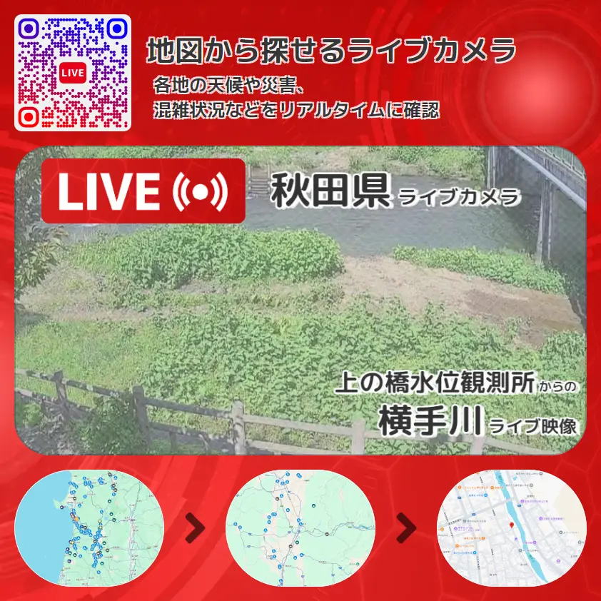 横手川の他に、上の橋や周辺の気象状況も併せてチェックすることが可能で、台風・大雨・地震などの災害による被害状況も把握することができます。