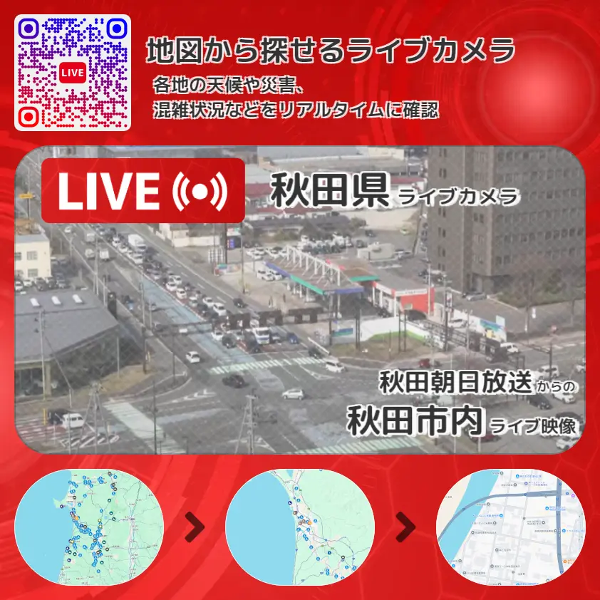 秋田市内の他に、国道7号や周辺の気象状況も併せてチェックすることが可能で、台風・大雨・地震などの災害による被害状況も把握することができます。