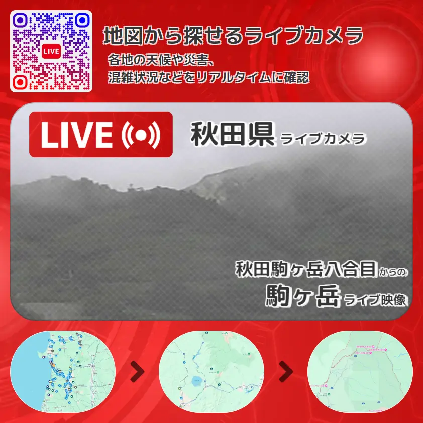 駒ヶ岳の他に、八幡平山系(秋田県側)や周辺の気象状況も併せてチェックすることが可能で、台風・大雨・地震などの災害による被害状況も把握することができます。