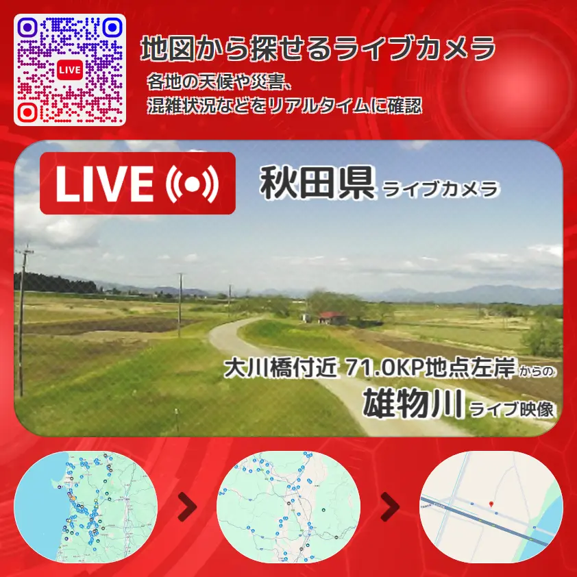 周辺の気象状況も併せてチェックすることが可能で、台風・大雨・地震などの災害による被害状況も把握することができます。