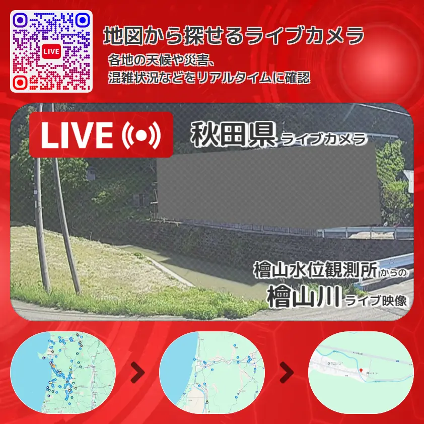 檜山川の他に、河原町橋や周辺の気象状況も併せてチェックすることが可能で、台風・大雨・地震などの災害による被害状況も把握することができます。