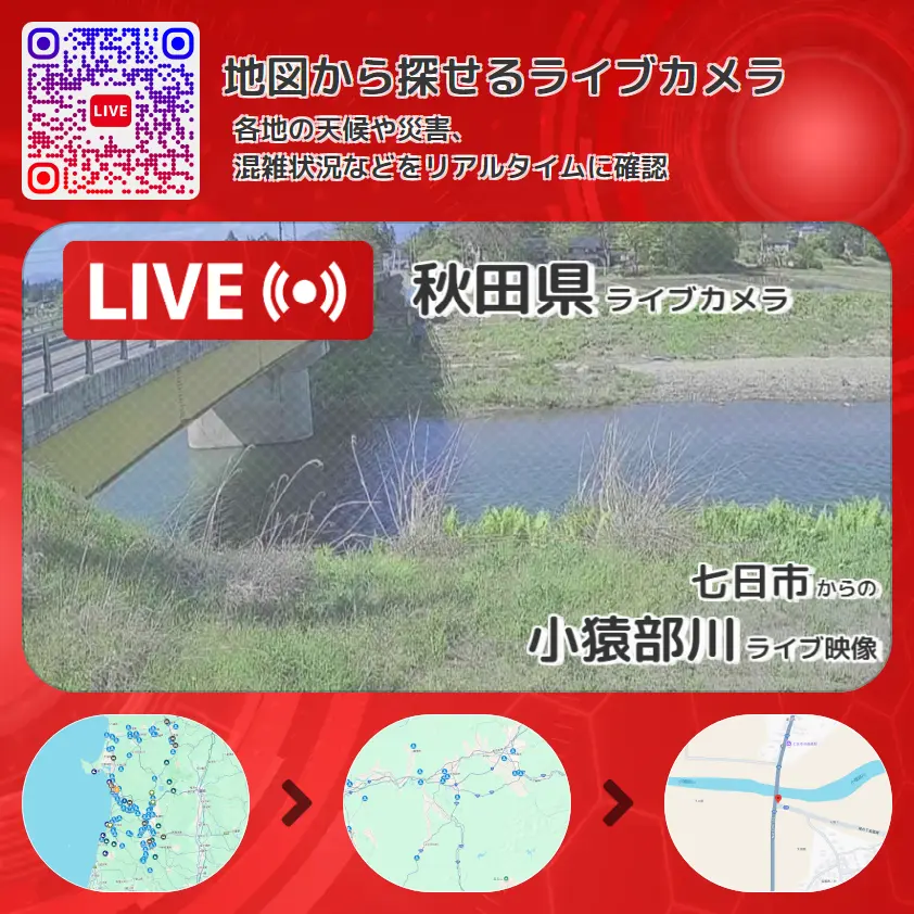 小猿部川の他に、小猿部橋や周辺の気象状況も併せてチェックすることが可能で、台風・大雨・地震などの災害による被害状況も把握することができます。