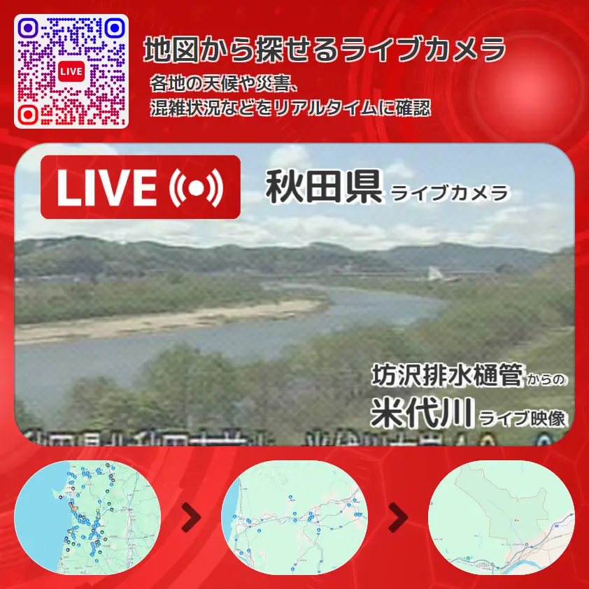 周辺の気象状況も併せてチェックすることが可能で、台風・大雨・地震などの災害による被害状況も把握することができます。