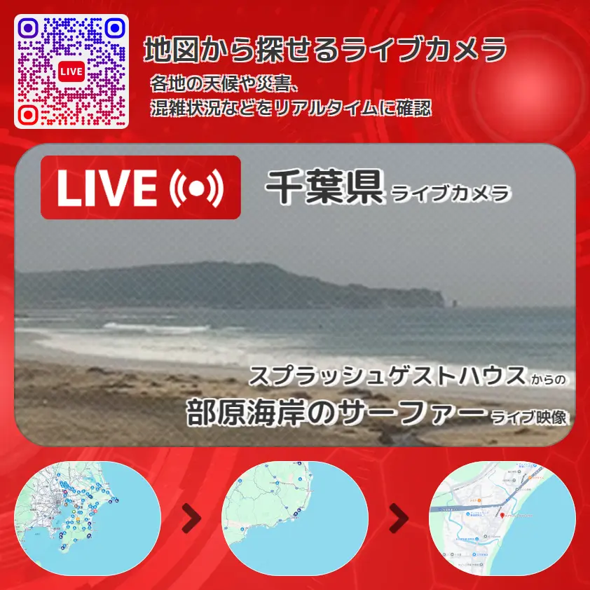 部原海岸のサーファーの他に、波の状態や周辺の気象状況も併せてチェックすることが可能で、台風・大雨・地震などの災害による被害状況も把握することができます。