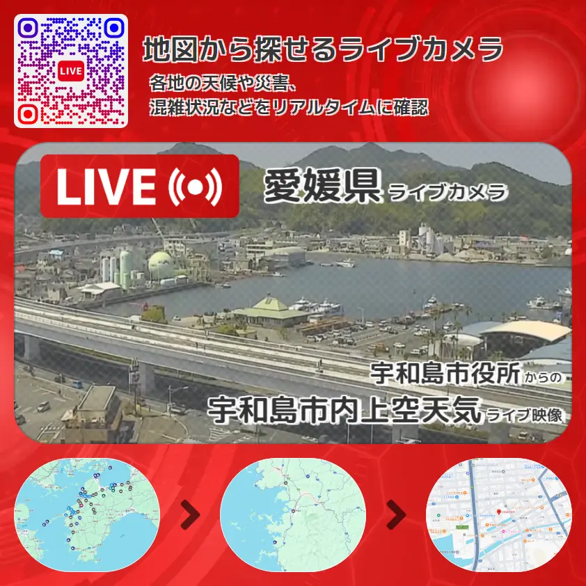 宇和島市内上空天気の他に、宇和島道路(国道56号バイパス)や周辺の気象状況も併せてチェックすることが可能で、台風・大雨・地震などの災害による被害状況も把握することができます。