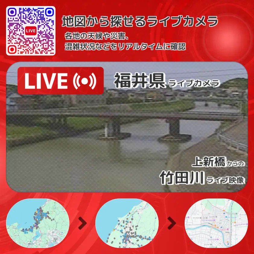 周辺の気象状況も併せてチェックすることが可能で、台風・大雨・地震などの災害による被害状況も把握することができます。