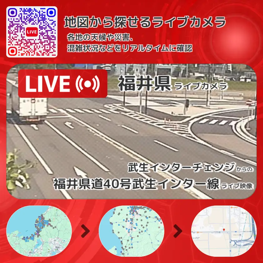 福井県道40号武生インター線の他に、福井県道262号武生インター東線や周辺の気象状況も併せてチェックすることが可能で、台風・大雨・地震などの災害による被害状況も把握することができます。