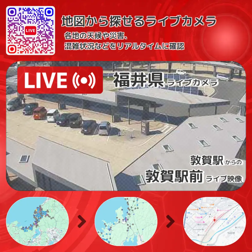 敦賀駅前の他に、敦賀駅前タクシー乗り場や周辺の気象状況も併せてチェックすることが可能で、台風・大雨・地震などの災害による被害状況も把握することができます。