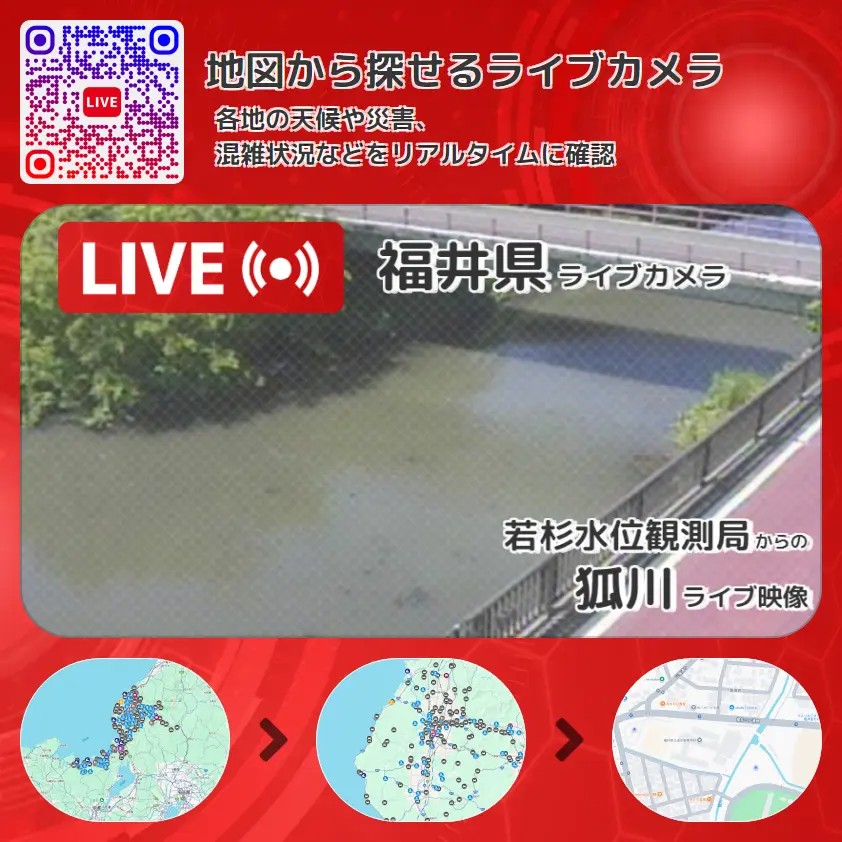 狐川の他に、福井県道6号福井四ヶ浦線や周辺の気象状況も併せてチェックすることが可能で、台風・大雨・地震などの災害による被害状況も把握することができます。
