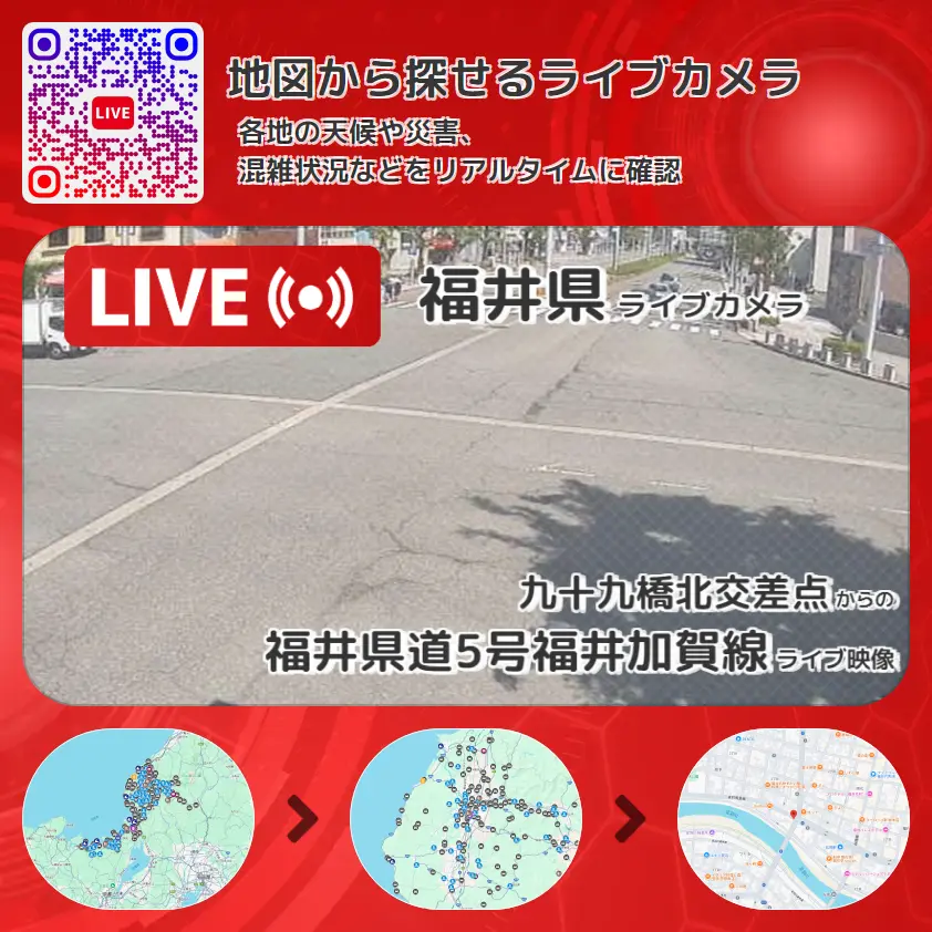 福井県道5号福井加賀線(芦原街道)の他に、福井県道6号福井四ヶ浦線(中央大通り)や周辺の気象状況も併せてチェックすることが可能で、台風・大雨・地震などの災害による被害状況も把握することができます。