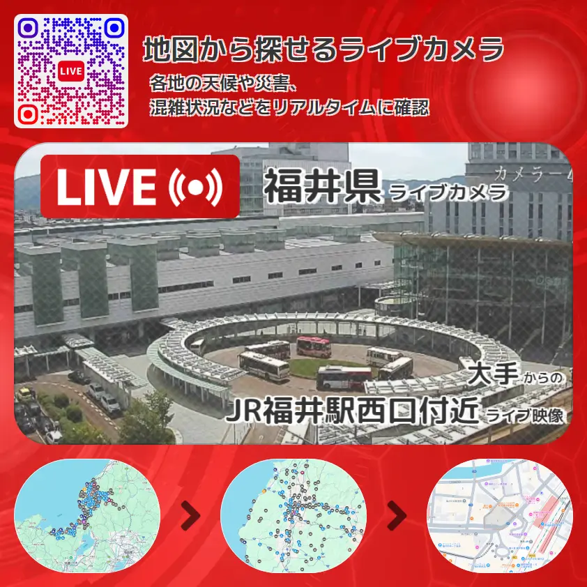 JR福井駅西口付近の他に、福井県道11号福井停車場線(中央大通り)や周辺の気象状況も併せてチェックすることが可能で、台風・大雨・地震などの災害による被害状況も把握することができます。
