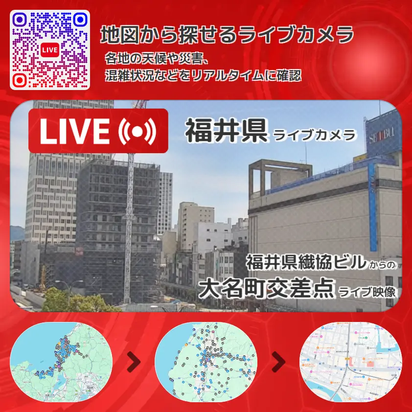 大名町交差点の他に、福井県道5号福井加賀線や周辺の気象状況も併せてチェックすることが可能で、台風・大雨・地震などの災害による被害状況も把握することができます。