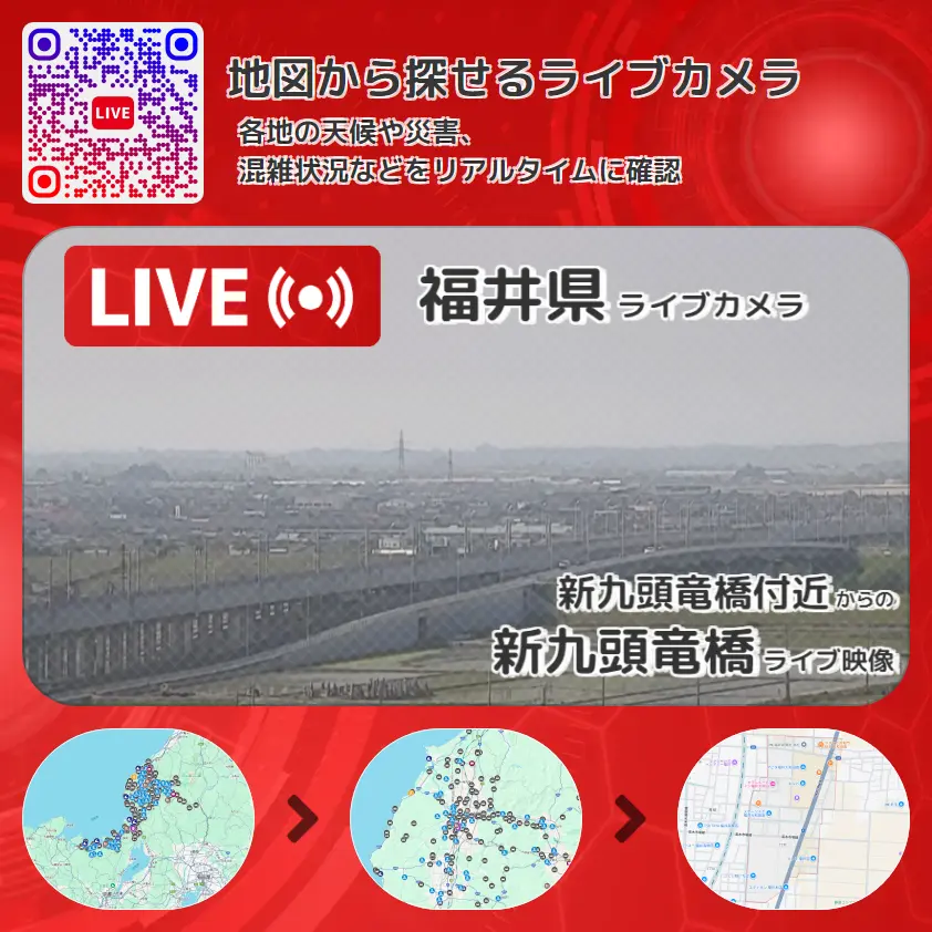 新九頭竜橋の他に、九頭竜川や周辺の気象状況も併せてチェックすることが可能で、台風・大雨・地震などの災害による被害状況も把握することができます。