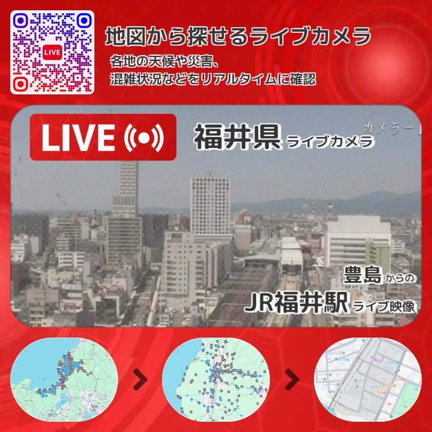 JR福井駅(北陸本線・越美北線・北陸新幹線)の他に、福井県道5号福井加賀線(城の橋通り)や周辺の気象状況も併せてチェックすることが可能で、台風・大雨・地震などの災害による被害状況も把握することができます。