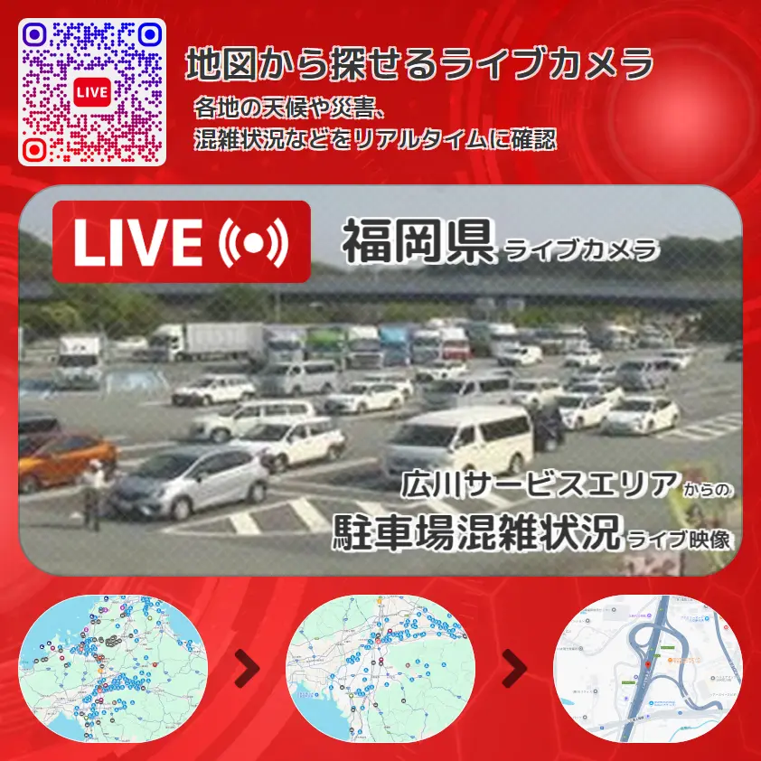 駐車場混雑状況の他に、九州自動車道(九州道)や周辺の気象状況も併せてチェックすることが可能で、台風・大雨・地震などの災害による被害状況も把握することができます。