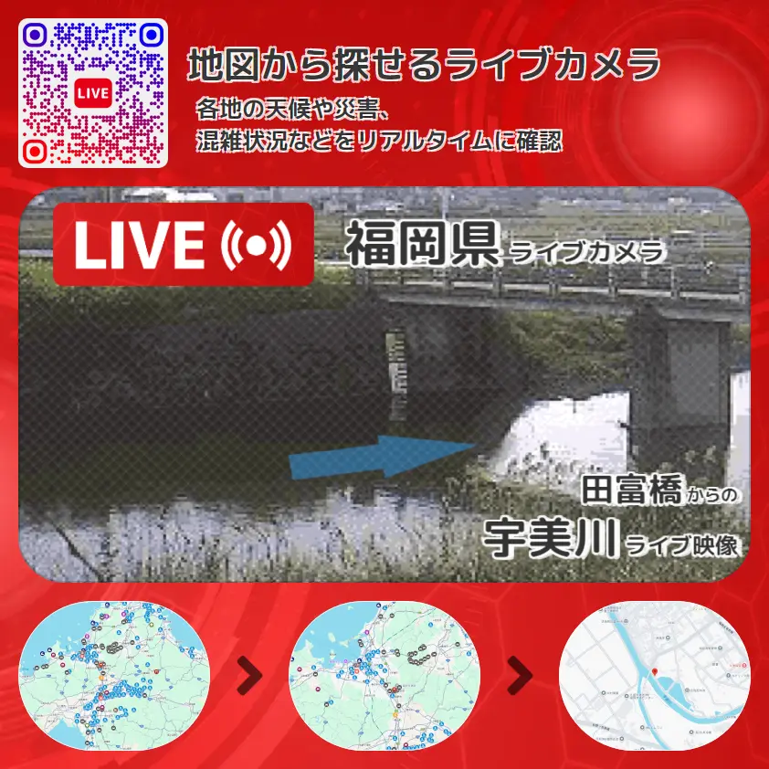 宇美川の他に、田富橋や周辺の気象状況も併せてチェックすることが可能で、台風・大雨・地震などの災害による被害状況も把握することができます。