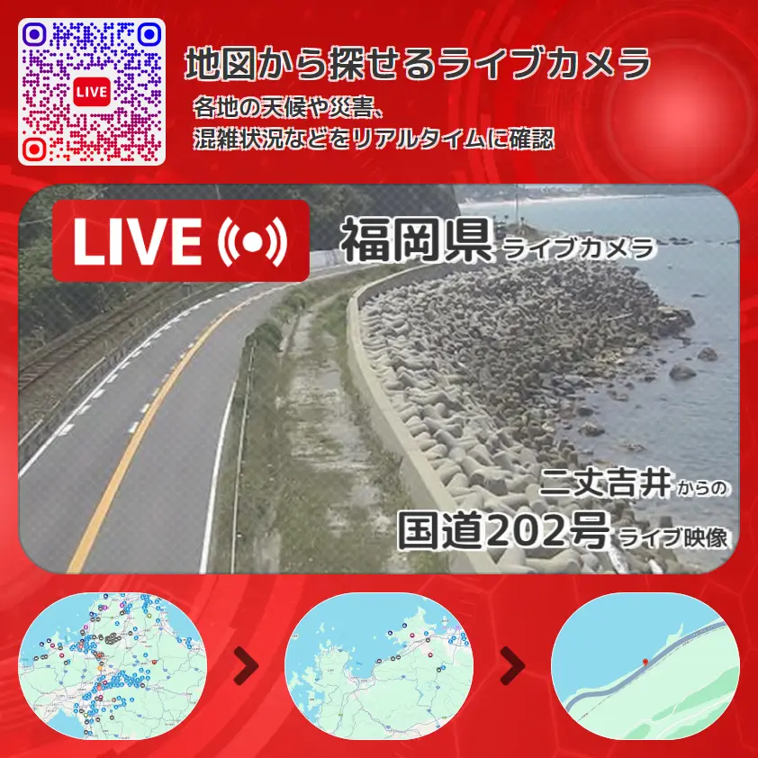 国道202号(唐津街道)の他に、玄界灘や周辺の気象状況も併せてチェックすることが可能で、台風・大雨・地震などの災害による被害状況も把握することができます。