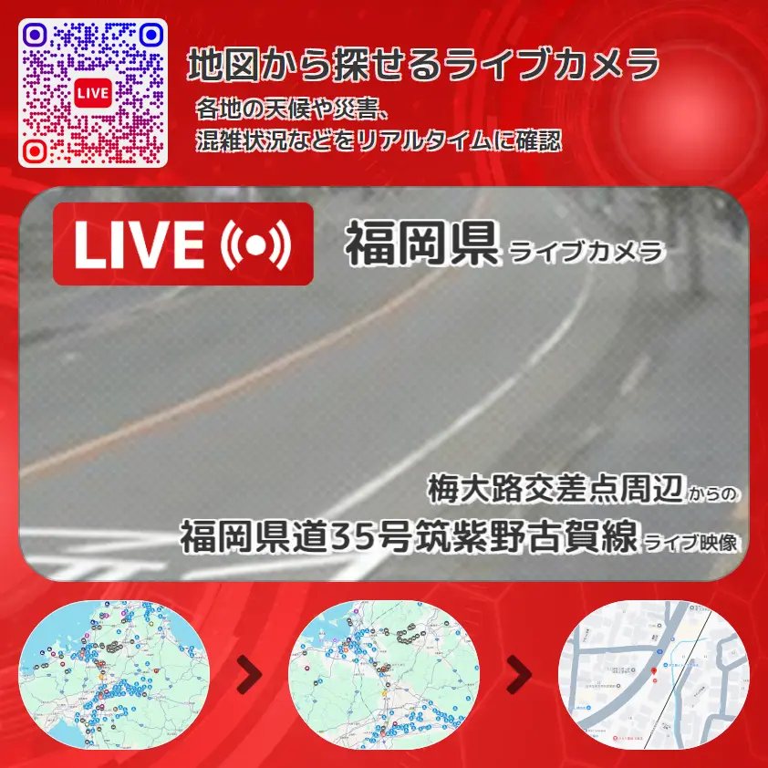 福岡県道35号筑紫野古賀線の他に、太宰府天満宮方面や周辺の気象状況も併せてチェックすることが可能で、台風・大雨・地震などの災害による被害状況も把握することができます。