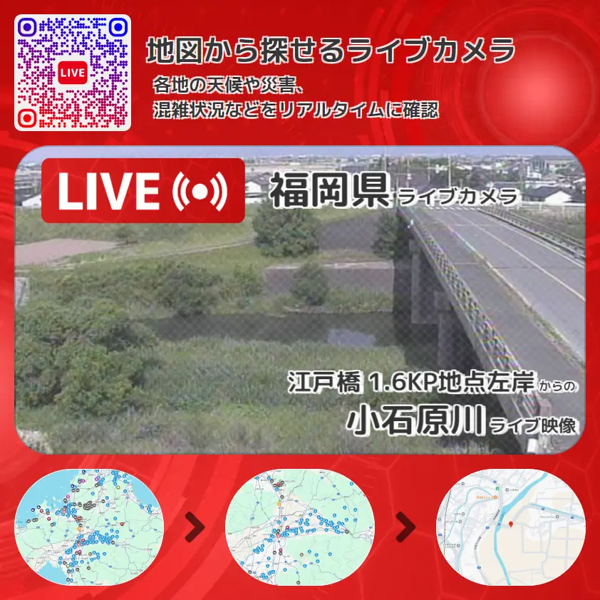 小石原川の他に、江戸橋や周辺の気象状況も併せてチェックすることが可能で、台風・大雨・地震などの災害による被害状況も把握することができます。