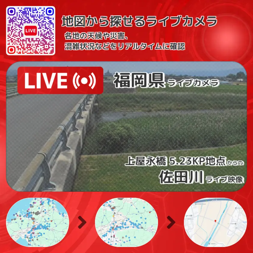 佐田川の他に、上屋永橋や周辺の気象状況も併せてチェックすることが可能で、台風・大雨・地震などの災害による被害状況も把握することができます。