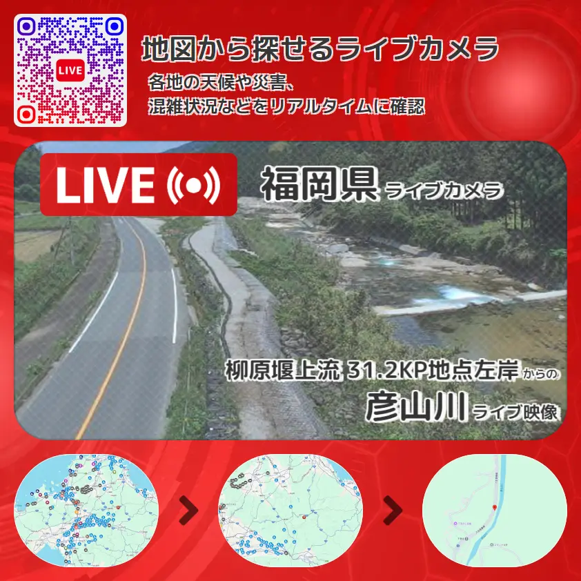 彦山川の他に、福岡県道52号八女香春線や周辺の気象状況も併せてチェックすることが可能で、台風・大雨・地震などの災害による被害状況も把握することができます。