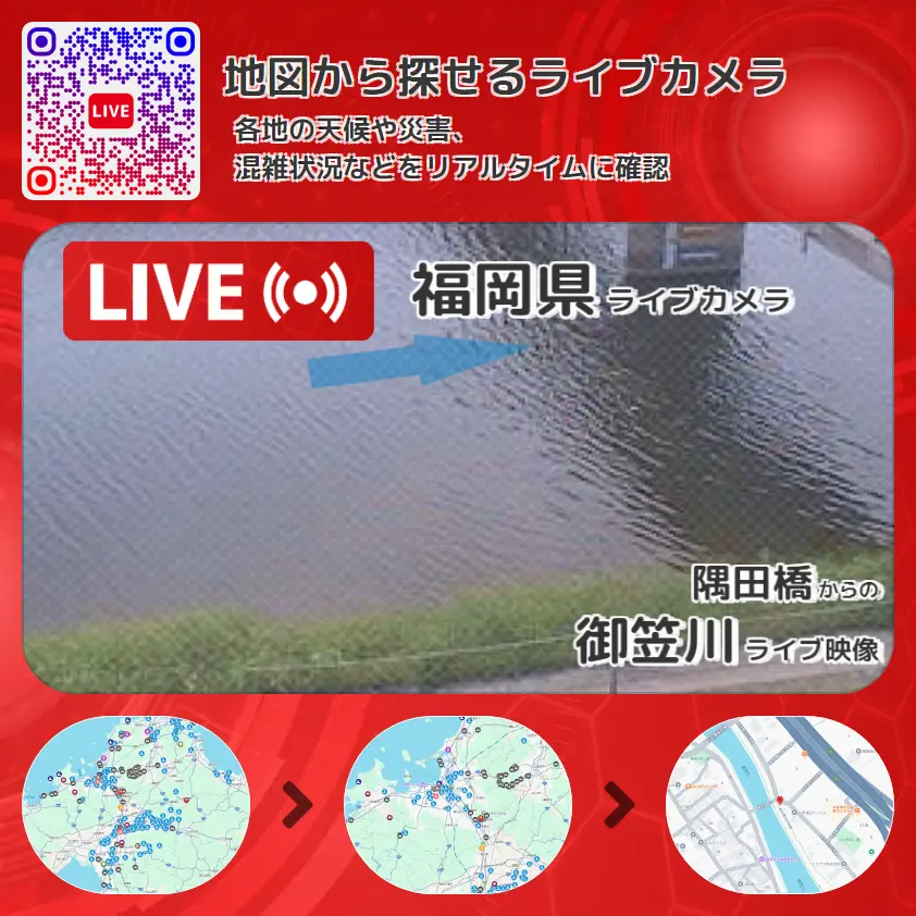 御笠川の他に、隅田橋や周辺の気象状況も併せてチェックすることが可能で、台風・大雨・地震などの災害による被害状況も把握することができます。