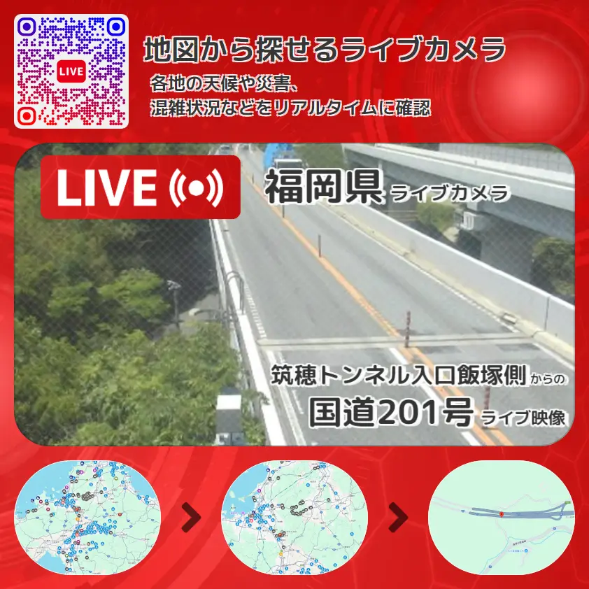 国道201号(八木山バイパス)の他に、筑穂トンネル入口飯塚側や周辺の気象状況も併せてチェックすることが可能で、台風・大雨・地震などの災害による被害状況も把握することができます。
