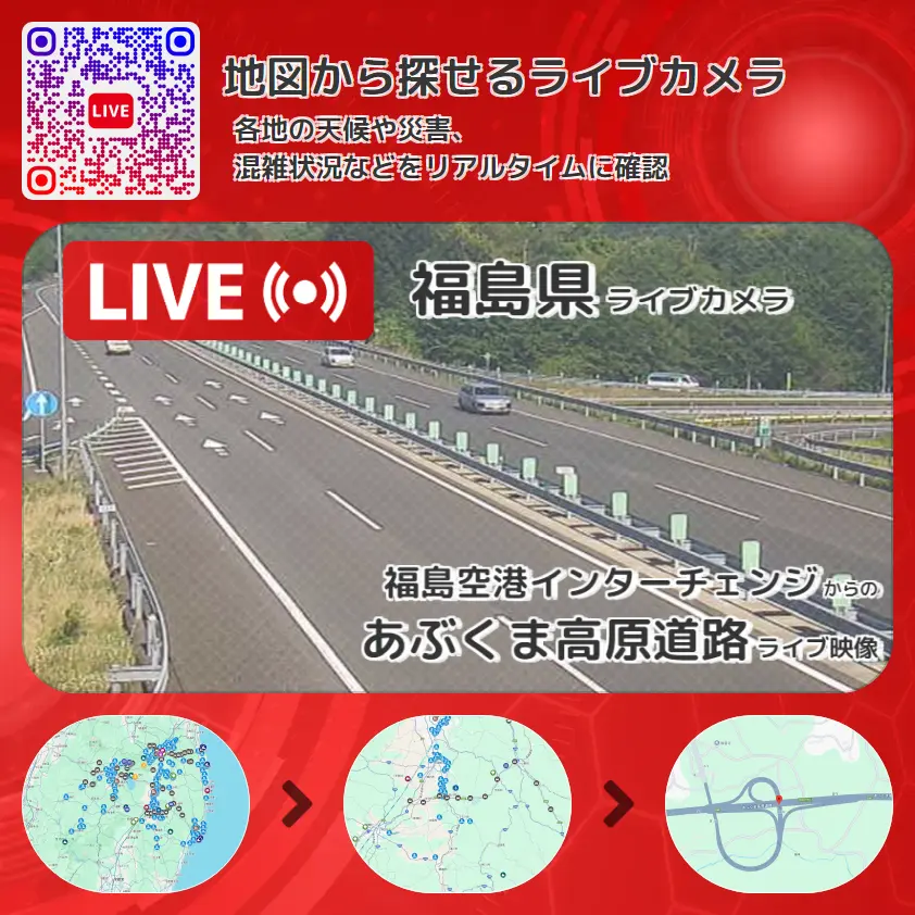あぶくま高原道路(あぶくま高原自動車道)の他に、福島県道42号矢吹小野線や周辺の気象状況も併せてチェックすることが可能で、台風・大雨・地震などの災害による被害状況も把握することができます。