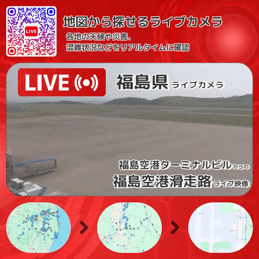 福島空港滑走路の他に、駐機場や周辺の気象状況も併せてチェックすることが可能で、台風・大雨・地震などの災害による被害状況も把握することができます。