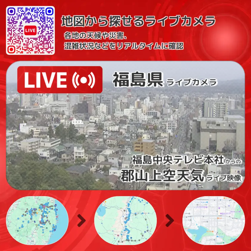 郡山上空天気の他に、文化通りや周辺の気象状況も併せてチェックすることが可能で、台風・大雨・地震などの災害による被害状況も把握することができます。