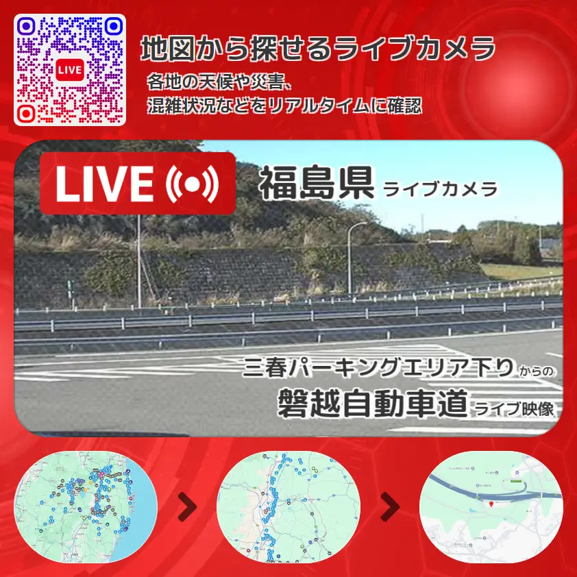 磐越自動車道(磐越道)の他に、船引三春インターチェンジ(船引三春IC)~郡山東インターチェンジ(郡山東IC)や周辺の気象状況も併せてチェックすることが可能で、台風・大雨・地震などの災害による被害状況も把握することができます。