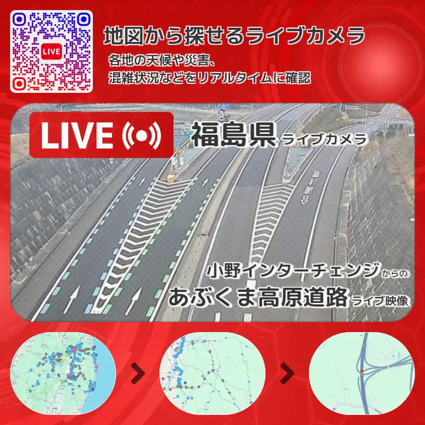 あぶくま高原道路(あぶくま高原自動車道)の他に、福島県道42号矢吹小野線や周辺の気象状況も併せてチェックすることが可能で、台風・大雨・地震などの災害による被害状況も把握することができます。